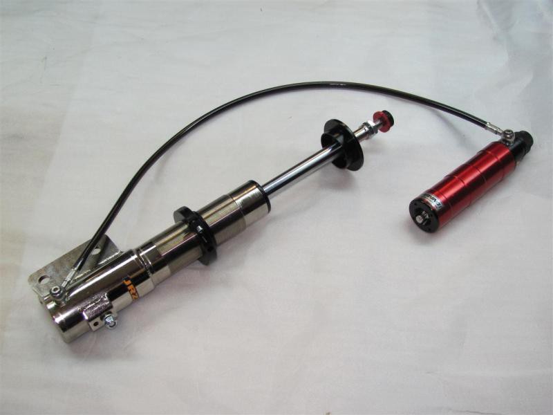The double-adjustable shock allows external adjustment of both rebound and compression. In addition to the same precise and accurate rebound adjustment mechanism in the single-adjustable, the double-adjustable shock has a remote reservoir with the compression adjuster and gas volume. This reservoir is connected to the shock with a Teflon-lined high-pressure hose and uses a 22mm piston rod. The double-adjustable allows you to refine the handling of your car by adjusting both the rebound on the shock rod and the compression blow-off valve in the remote reservoir. Ideal for racing where the rules prohibit more than 2-way adjustment